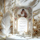 Anuncie seu dia especial com este convite de casamento opulente e personalizado. Este belo design apresenta uma elegante estrutura de ouro dourada, inspirada no Barroco, intricadamente detalhada com folhas de acanto rolante, florescimento de ornamentados e um espaço oval proeminente no topo para mostrar sua foto de noivado favorita. O magnífico quadro é sumptuamente adornado com belos rosas ao estilo vintage em tons de rosa empoeirado, cor-de-rosa mudado e rosa antigo, entrelaçados com folhagem verde rica. Abaixo da área de fotos personalizável, um painel em forma graciosa fornece espaço para seus detalhes de casamento, tudo dentro da fronteira de ouro e floral opulente. Uma caixa encantadora na base é perfeita para adicionar suas iniciais. Este design luxuoso, reminiscente da antiga artista europeia, é perfeito para casais que buscam uma estética grandiosa, romântica e eterno. O verso oferece "Os Detalhes Mais Finos" para informações de convidados, mantendo o mesmo enquadramento de ornamentado impressionante.