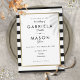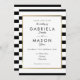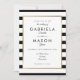Este convite para o casamento de na moda apresenta uma elegante borda de folha de ouro falsa que enquadra seus detalhes de casamento em tipografia quic em um clássico fundo listrado preto e branco. Projetado por Thisnotme©