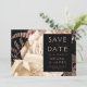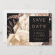 Este elegante e melancólico casamento Salve o cartão de Data apresenta um buquê floral robusto e romântico em marfim com folha de ouro rosa e folhagem brilhante num fundo negro. Personalize o texto de cor rosa em fontes na moda num retângulo preto e adicione o URL do site de casamento ao fundo preto sólido.