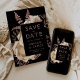 Este elegante e melancólico casamento Salve o cartão de Data apresenta um buquê floral robusto e romântico em marfim com folha de ouro rosa e folhagem brilhante num fundo negro. Personalize o texto cor-de-rosa rosa em fontes na moda num retângulo preto e adicione o URL do Web site de casamento ao fundo preto sólido.