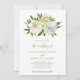 Elegante convite de casamento floral com flores pintadas a aquarelas em tons neutros de marfim, branco e champanhe junto com um pouco de verde. Abaixo estão seus detalhes de casamento em tom dourado com palavras sotaques em roteiro. Este sofisticado convite de casamento é excelente para um casamento de primavera ou verão.