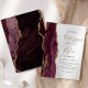 A borda esquerda deste elegante convite de casamento moderno mostra uma borda de água borrifada, cortada com falsa brilho dourado. O texto personalizável combina um script de escrita manual dourado com a letra sans serif preta num fundo de mármore branco e cinza prateada. O lado inverso apresenta uma burgundy e uma design de agata dourada.