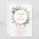 Este convite para o casamento de Natal apresenta cor d'água eucalipto, folhas verdes, bagas vermelhas, galhos de pínus, e uma falsa estrutura de círculo dourado com fundo vermelho no verso. Para personalização mais avançada deste design, clique no link "Personalizar mais". Itens correspondentes também estão disponíveis.