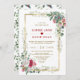 Design de cartão elegante com falso quadro dourado adornado com flores brancas, vermelhas, verde de inverno, morango sagrado, amora névoa, sobre fundo branco. Use a ferramenta Personalizar para adicionar suas informações. Para obter itens correspondentes, visite minha coleção de feriados.