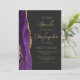 A borda esquerda deste elegante convite de casamento moderno apresenta uma cor d'água roxa, borda agitada, aparada com falso brilho dourado. O texto dourado personalizável combina o script de escrita manual moderno e as fontes sans serif em um fundo preto de slate. O verso apresenta um design de agate roxo e dourado correspondente.