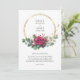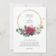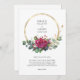 Convite de casamento de rosa vermelha com rosas vermelhas de aquarela, folhas de eucalipto e um quadro redondo geométrico dourado. O modelo está pronto para que você adicione seus detalhes de convite da frente, assim como as iniciais da noiva e do monograma do noivo no verso. Tema floral botânico com tipografia simples e elegância moderna.