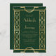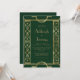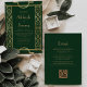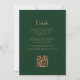 Este elegante convite de casamento inspirado na vintage apresenta texto dourado num fundo verde esmeralda escura, enquadrado por uma na moda vintage art deco border em folha de ouro falsa. O verso fornece espaço para detalhes do casamento em um fundo verde escuro sólido, junto com um código QR que os convidados podem digitalizar para visitar seu site e RSVP, o que economiza o custo de imprimir e enviar cartões RSVP separados.