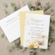 Grande buquê de cor d'água elegante e romântica de flores amarelas brancas e douradas ao longo do topo do convite de casamento com código QR para RSVP e detalhes.