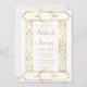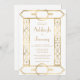 Este elegante convite de casamento inspirado na vintage apresenta texto dourado num fundo branco, enquadrado por uma na moda vintage geométrica deco border em folha de ouro falsa. O verso fornece espaço para detalhes do casamento em um fundo branco sólido, junto com um código QR que os convidados podem digitalizar para visitar seu site e RSVP, o que economiza o custo de imprimir e enviar cartões RSVP separados.