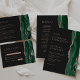 A borda direita deste elegante e moderno convite de casamento apresenta uma esmeralda verde aquarela agate borda aparada com falsa rosa dourada. O texto personalizável combina fontes rosa cor-de-rosa, copperplate e itálico em um fundo preto de ardósia. O verso apresenta um design emerald verde e rosa dourado.