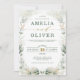 Este elegante convite de casamento de temas botânicos apresenta lindas folhas de verde-aquarela em verde e ouro e tipografia elegante combinando um texto moderno de corte limpo e um toque de caligrafia
