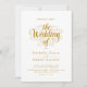 Este elegante convite de casamento branco e ouro é perfeito para um casamento moderno. O simples design apresenta uma elegante caligrafia dourada sobre um fundo branco limpo. O cartão de convite inclui os detalhes do casamento no verso, em vez de pagar um cartão separado.
