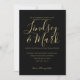 Nomes de guião de mão de ouro elegantes sobre o convite de casamento negro ousado com a redação moderna.