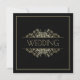 Um Convite para Casamento Dourado e Preto Elegante desenhado com texto dourado sobre fundo preto. O texto da frente inclui: WEDDING, com sotaques dourados e borda. O texto inverso inclui: Os Nomes de Cheio da Noiva e do Groom, Data de Casamento, Hora, Local e Nota de Recepção em um plano de fundo de linha correspondente, com borda preta. Para personalizar, basta inserir o texto no nosso modelo fácil, substituindo o texto de exemplo.