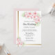 Um convite de casamento elegante com orquídeas cor-de-rosa e uma fronteira assimétrica de ouro na moda. Foi incluída uma solicitação de RSVP para lembrar seus convidados de confirmar sua presença no dia especial.