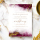 Este elegante convite para o casamento mostra um design vermelho-borrifado de borda de água em imitação de mármore veinado com folha de ouro falsa, desaparecendo gradualmente no fundo branco. A palavra "casamento" aparece em escrita manuscrita dourada, com o texto remanescente em maiúsculas de serifa douradas. O padrão de burgundy e dourado é repetido na parte de trás da carta.