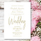 Um convite de casamento branco elegante e minimalista com texto dourado.