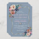 Design romântico, elegante, com delicada cor d'água azul empoeirado, buquês de flores rosa, falso quadro de ouro, lindo divisor floral, sobre fundo azul empoeirado. Na parte de trás, um buquê de rosa-névoa azul empoeirado. Use a ferramenta Personalizar para adicionar suas informações. Para obter itens correspondentes, visite minha Coleção de Flores Azuis Douradas.