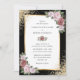 Convide seus convidados para a sua festa de casamento escura e preta com estes elegantes convites para casamento florais com flores cor-de-rosa e verde armando os detalhes do casamento dentro de uma moldura dourada adornada com o confete dourado. Itens correspondentes disponíveis.