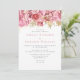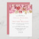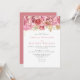 Este convite romântico de casamento floral apresenta uma borda floral rosa e dourada. Os nomes do casal aparecem na fonte típica de serif rosa, com o texto restante em sans serif, em um fundo branco. A parte traseira da placa é uma sombra coordenada de rosa sólido.