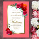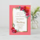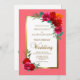 Convite para casamento floral vermelho e rosa elegante com uma borda rosa e dourada.