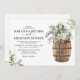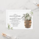 Convites de casamento elegantes, com um barril de vinho de madeira rústico, com as suas iniciais gravadas no lado, com uma apresentação floral verde e floral tradicional, e um modelo de casamento de rico que é fácil de personalizar.