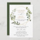 Este convite de casamento elegante e personalizável apresenta uma moldura geométrica dourada adornada com bela folhagem de aquarela verde e foi combinado com uma caligrafia caprichosa e uma fonte serif elegante em dourado e cinza. Para fazer alterações avançadas, selecione a opção "Clique para personalizar ainda mais" em Personalizar este modelo.