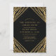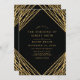 Convite de Casamento Dourado Geométrico das Linhas Geométricas Negras. Este elegante e moderno design abstrato da tendência apresenta linhas brilhantes de ouro com confete sobre um fundo negro sólido.