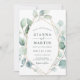 Este convite para o casamento apresenta cores aquáticas pintadas de eucalipto e folhas verdes botânicas com uma estrutura geométrica dourada.