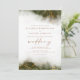 Este elegante convite de casamento apresenta um design de borda de cor aquosa verde-oliva na imitação de mármore veinado com folha de ouro falsa, desaparecendo gradualmente no fundo branco. A palavra "casamento" aparece em escrita manuscrita dourada, com o texto remanescente em maiúsculas de serifa douradas. O padrão do mármore verde-oliva e dourado é repetido no verso do cartão.
