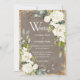 Garganta pulverização botânica floral branca de hydrangeas e rosas com acentos de ouro verde, eucalipto e vintage. Lindo fundo castanho rústico. Este é um convite tão bonito. Bonita e perfeita para qualquer estação e seu evento especial.