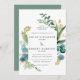 A folhagem botânica azul-lacrimogênea dramática cria uma estrutura de aquarela moderna. Folhas Douradas e galhos dão ao convite de casamento uma elegante vibe luxe. Cantos abertos lhe dão qualidade de leite. Juntos, criam o design floral rústico Boho Chic. Uma seringa dourada traz o design para o texto.