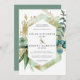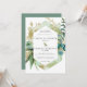 Folhagem botânica azul-lacrimogênea e lavagem a aquarela criam uma estrutura moderna. Folhas Douradas e galhos dão ao convite de casamento uma elegante vibe luxe. Juntos, criam o design floral rústico Boho Chic. Uma seringa dourada traz o design para o texto.