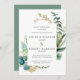 A folhagem botânica azul-lacrimogênea dramática cria uma estrutura de aquarela moderna. Folhas Douradas e galhos dão ao convite de casamento uma elegante vibe luxe. Cantos abertos lhe dão qualidade de leite. Juntos, criam o design floral rústico Boho Chic. Uma seringa dourada traz o design para o texto.