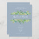 Verde botânico eucalipto garland convite de casamento com folhas de folhagem de cor d'água em um fundo azul empoeirado com tipografia branca elegante. Personalize com sua informação especial do dia do casamento. Projetado por Thisnotme©