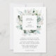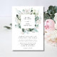 Um design elegante com lírios brancos, rosas, eucalipto, verde e outros produtos de aquarela em azuis poeirentos e verdes de sábios. A parte de trás do convite apresenta um adorável buquê floral branco e verde e é personalizado com os nomes do casal de casamento e a data do casamento. Perfeito para muitos temas de casamento — primavera, verão, inverno, país, praia e muito mais. Acessórios correspondentes disponíveis.