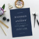 Convite de casamento azul moderno com design de tipografia elegante. Personalize com todos os seus detalhes para um convite de casamento.
