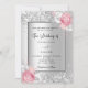 Fundo de aspecto fino prateado decorado com flores brancas e cor-de-rosa, flores e brilho fino prateado, brilhos. Personalize e adicione seus nomes e detalhes do casamento. Letras negras.