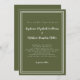 O Convite de Casamento Clássico e Elegante apresenta um simples design minimalista contemporâneo com uma dupla borda de quadros em branco nítido sobre um fundo verde-oliva. A formulação tradicional proporciona sofisticação eterno mas moderna. Personalize o design de casamento com seus detalhes em letras brancas e roteiro nítidos. A parte traseira da placa corresponde em verde estável.