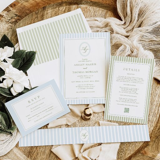 Convites Casamento Elegante com Listras em Azul e Salvia