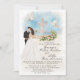 Casamento romântico Convite elegante representando Noiva e Groom numa bela Fonte com flores florais, e um fundo de ouro com duas pombas atrás