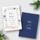 Flores anêmonas brancas com galhos ouros e folhas formando uma bela estrutura. (Dourado não é ouro real, mas impresso.) fundo azul marinho. Monogramas da noiva e do noivo com folhas de ouro. Design de casamento elegante e moderno.