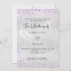 Um convite de casamento moderno, elegante e minimalista. Fundo metálico de aspecto fino prateado, decorado com poeira de cinza púrpura e poeira brilhante e uma borboleta como marca de água. Personalize e adicione seus nomes e detalhes do casamento. Letras pretas coloridas.