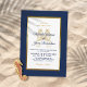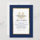Convide seus hóspedes para ajudá-lo a celebrar seu dia especial com este convite elegante que inclui textos modernos, marinho azul e dourado, incluindo cavalos de mar artísticos e uma folha de ouro metálico na frente do cartão. Um fundo azul marinho está na frente e atrás.