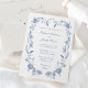Estes elegantes, empoeirados convites para casamento de cor azul e branca apresentam um quadro floral de cor azul-d-água com lindas folhas botânicas, e caligrafia de na moda, juntamente com texto clássico. O design de toile azul francês acrescentará um toque romântico e chic à sua papelaria de casamento.