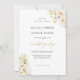 Simples convite para casamento da boêmia tropical de verão da praia, com flores brancas e douradas, com palmeiras secas e buquês de capim de palma, em tons sujos e um roteiro elegante de caligrafia elegante. ++++++++ Adequado para casamentos de biquicolor floral praia elegante de trópicos exóticos.
