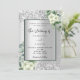 Fundo de aparência pura prateada decorado com flores brancas, flores, verde eucalipto e confete prateado falso. Personalize e adicione seus nomes e detalhes do casamento. Letras negras.