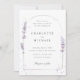 Lavanda de aquarelas dispostas num arco com aspersão de aquarela e fundo de aquarela no verso. Convite para casamento floral elegante.