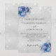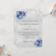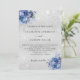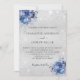 Fundo de aspecto fino prateado decorado com florais azuis e brilho falso, faíscas. Personalize e adicione seus nomes e detalhes do casamento. Letras pretas coloridas.