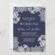 Simples e Eterno. Um lugar branco e delicado armou este convite de casamento. A amostra é mostrada com um plano de fundo azul de marinho clássico. A cor de fundo pode ser alterada para ser coordenada com o tema do casamento.